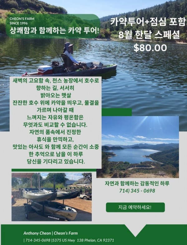 카약투어/펠란 Phelan USR 0 811 2024.08.06 13:28 점심 포함한 카약투어 소개합니다.자연을 만끽하는 1일 투어. #업소록닷컴 Upsorok.com #생활정보 TheKoreatown.com #부동산 알나무 Rtree.com #미국여행 #미국생활 #엘에이 #한인타운 #코리아타운 #오씨 #OC #오렌지카운티 #LA